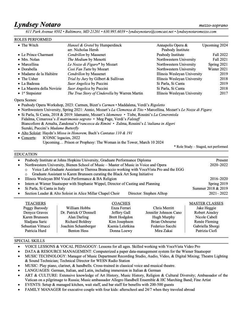 Lyndsey Notaro’s international studies include two summers at Si Parla, Si Canta in Italy. Interning at the Weiner Staatsoper with the director of casting and planning, Stephanie Wippel, Notaro helped plan the 150th Celebration of the Wiener Staatsoper, documented the tenure of artistic director Dominique Meyer, and arranged travel for the Staatsoper in Dusseldorf. In Austria, Notaro learned how important it is to be versatile and communicate effectively in multiple languages. She has traveled extensively in the United States, Europe, Russia, and China. She traveled as a delegate of the Vatican for the 100-year commemoration of the execution of the Romanovs and sang for the Pope at Domus Sanctae Marthae.